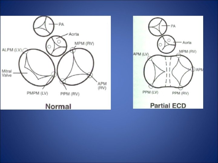 § Ecocardiograma: 1. DEMONSTRA o defeito; 2. Classifica em parcial, intermediário (ou total); 3. Demonstra a anatom ia das válvas AV`s e da inserção das cordoalhas do folheto ponte anterior conforme a classificação de Rastelli; 4. Demonstra a relação da valva AV com os ventrículos (balanceados ou desbalanceados); 5. Tamanho dos ventrículos; 6. Identifica lesões associadas; 7. Avalia o grau de regurgitação das valvas AV`s. § ECG: Apresenta quase que invariavelmente o clássico bloqueio divisional anterossuperior presente em cerca de 95% dos casos, o intervalo PR pode estar aumentado, além da sobrecar ga das câmaras direitas.