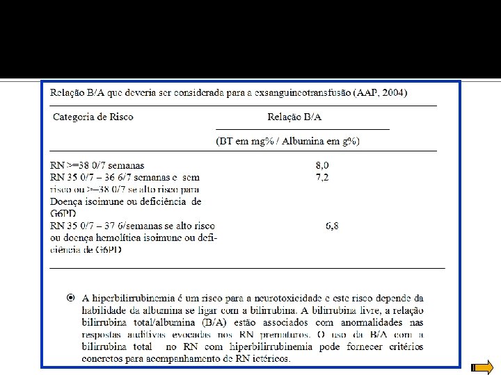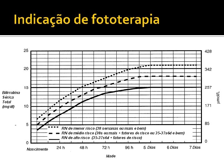 GRUPO DE ALTO RISCO Fatores maiores Fatores menores Níveis de bilirrubina na zona de alto risco Níveis de bilirrubina na zona intermediária Icterícia nas primeiras 24 h Idade gestacional 37 -38 sem Incompatibilidade ABO, Rh ou outra doença hemolítica (deficiência de G 6 PD) Icterícia observada antes da alta Idade gestacional 35 -36 sem RN macrossômico e filho de mãe diabética Irmão que recebeu fototerapia anteriormente Idade materna <= 25 anos Cefaloematoma ou sangramento importante Sexo masculino Aleitamento materno exclusivo com dificuldade de pega Raça asiática