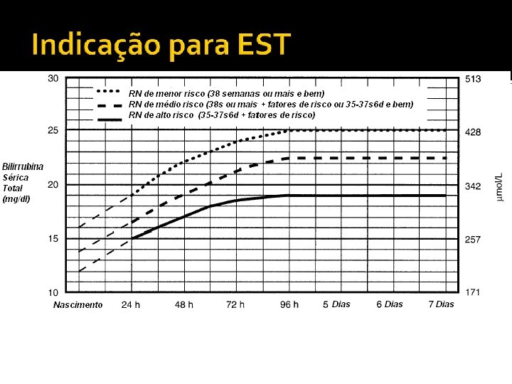 Indicações para EST Ø Precoce (12 -24 h) - Aumento de BT 0, 5 mg%/h OU: HORAS DE VIDA BILIRRUBINA TOTAL <12 >10 <18 >12 <24 >14