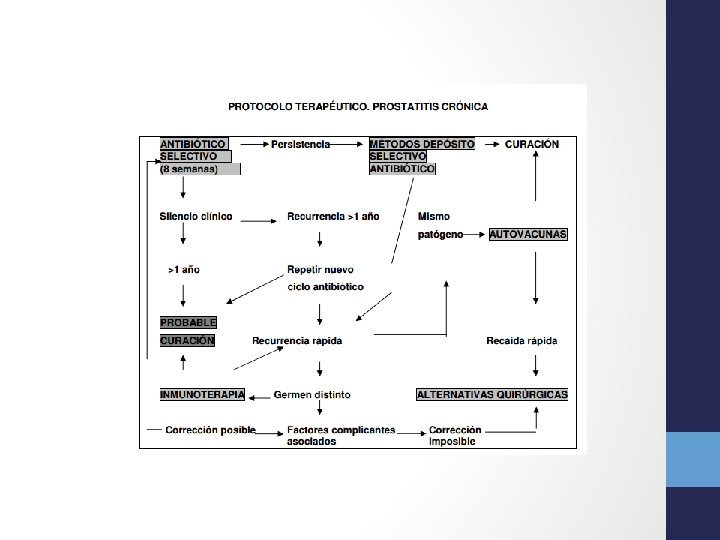 Prostatitis Aguda. Criterios de hospitalización § Deterioro importante del estado general § Sospecha de bacteriemia § Imposibilidad de cumplir con el tratamiento vía oral § Ausencia de respuesta a antibióticos § Aparición de retención urinaria (puede ser preciso sondaje suprapúbico para evitar lesiones prostáticas)