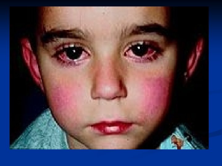 Doença de Kawasaki Agente etiológico desconhecido, de natureza infecciosa; n Afeta predominantemente criança abaixo dos 5 anos de idade; n Manifestações Clínicas: Febre / Congestão Ocular bilateral (hiperemia) / alteração dos lábios e cavidade oral / Exantema polimorfo / alteração nas extremidades / Linfadenopatia cervical não supurativa; n