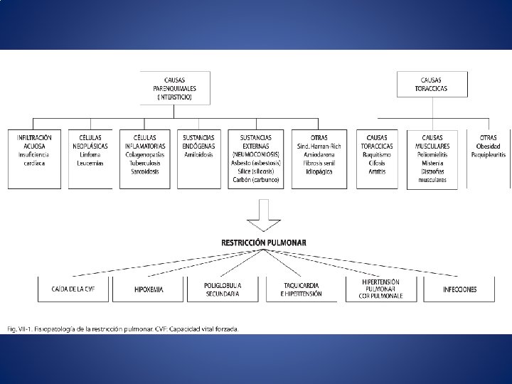 CASO CLÍNICO • Paciente masculino de 79 años, refiere disnea de esfuerzo progresiva desde hace un par de años. Al examen PA y frecuencia cardiaca normales, tolera decúbito, cianosis distal, impulso ventricular derecho con segundo ruido cardiaco muy aumentado en el área pulmonar. Pobre excursión (amplexación) de ambos hemitórax, crepitantes dispersos en ambos campos pulmonares. • a. Tipos de enfermedades restrictivas. Causas • b. Consecuencias hemodinámicas, hematológicas, gasométricas, espirométricas
