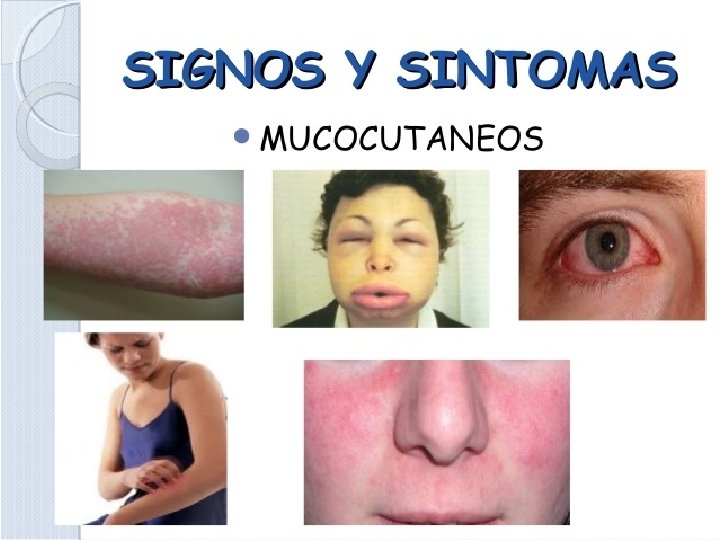 Anafilaxia • • • Dificultad respiratoria Choque, hipotensión Diarrea vómito Inflamación de mucosas Brote en menos de 4 horas