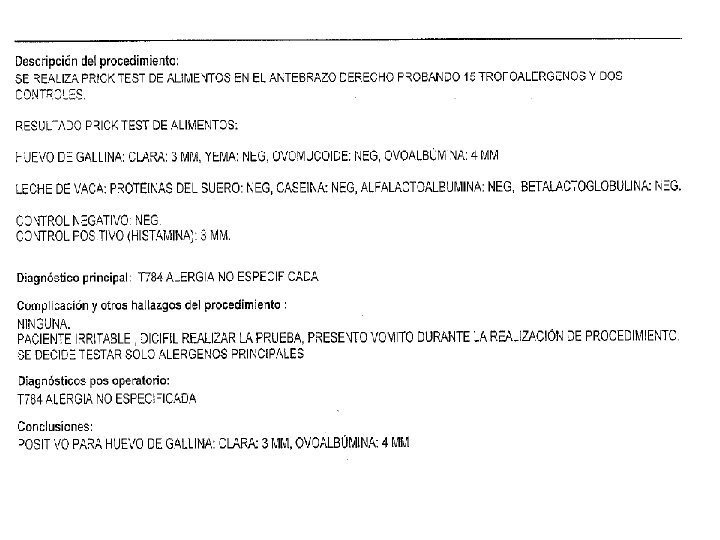 Juan tiene 16 meses. Cuando cumplió los 12 meses la madre inició lácteos y huevo presentando brote generalizado tipo habón, con edema palpebral , en lengua y labios.