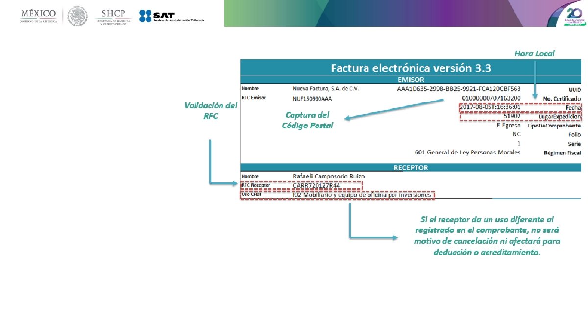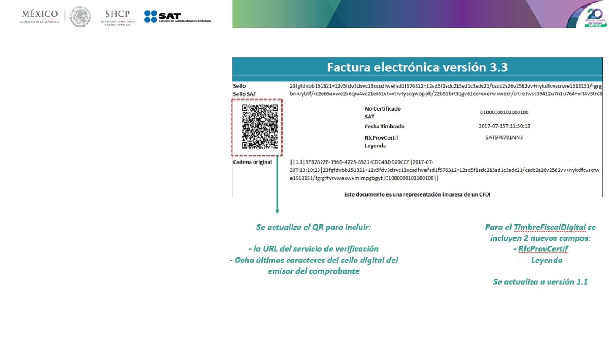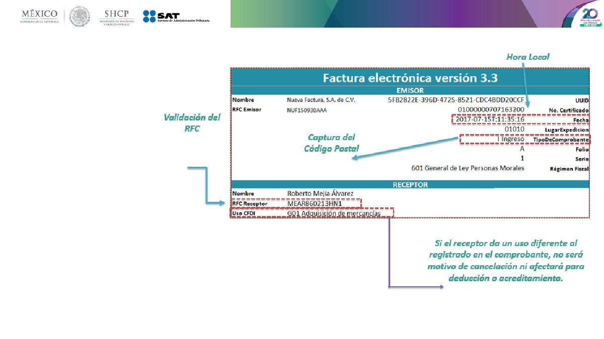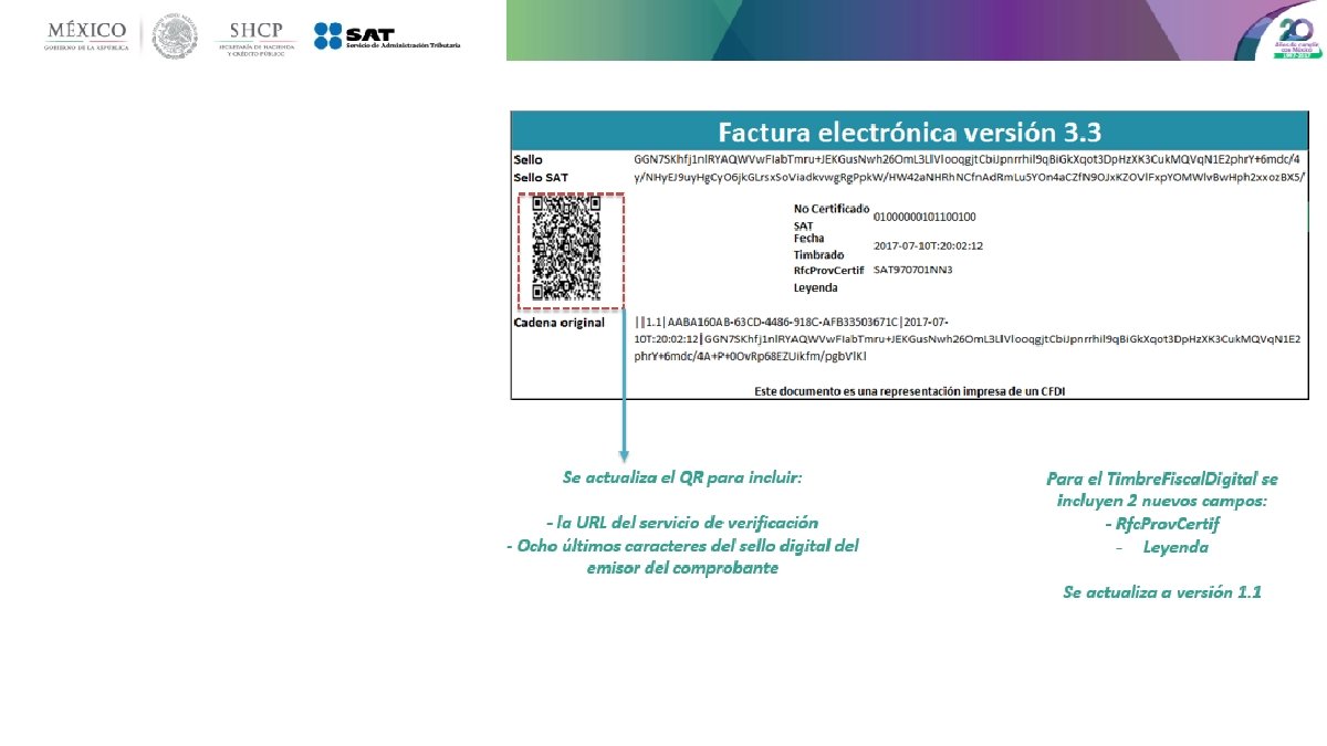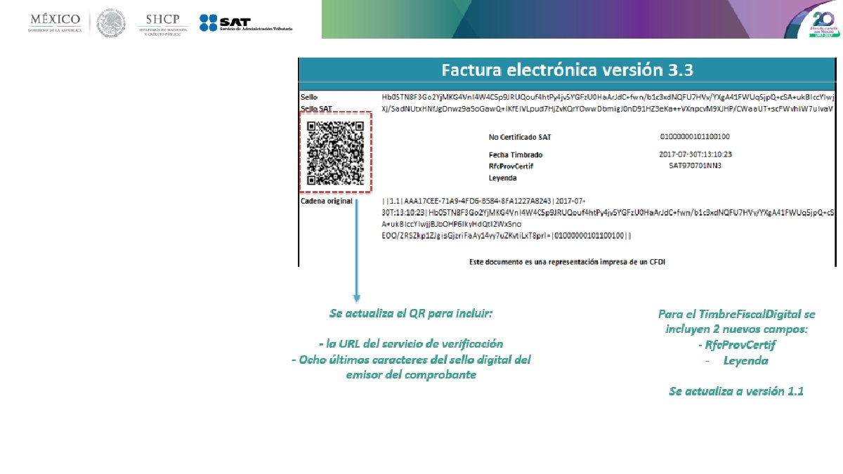 Principales cambios • Se incorporan nuevos tipos de comprobantes. • Se incluye el uso del comprobante desde el punto de vista del receptor. • Uso de las zonas horarias, basado en el código postal del emisor. • Unificación de catálogos y tipos de datos, comunes para CFDI y complementos. • Método y forma de pago están invertidos respecto de la versión vigente. • Se estandariza la relación entre los comprobantes. • Los conceptos deben tener una clave de producto o servicio y una unidad de medida estandarizada. • Se incluye por cada concepto sus descuentos e impuestos aplicables. • La serie y folio se integran a la cadena original. • Se actualiza el código QR de la representación impresa.