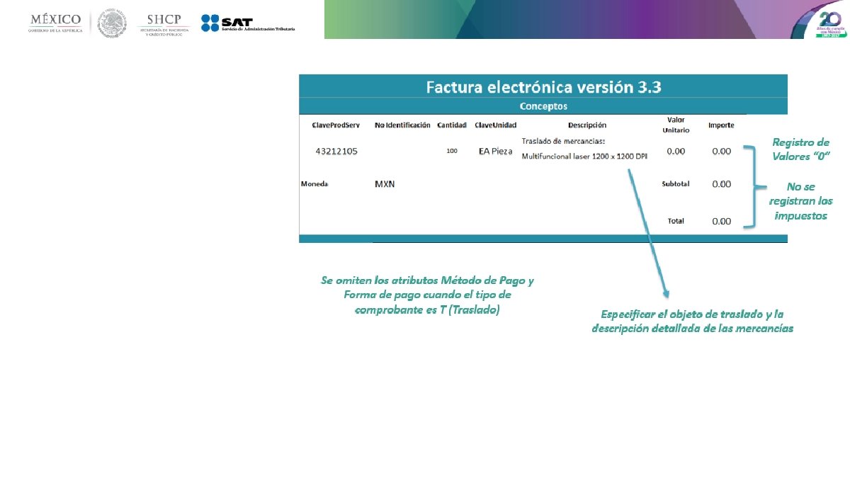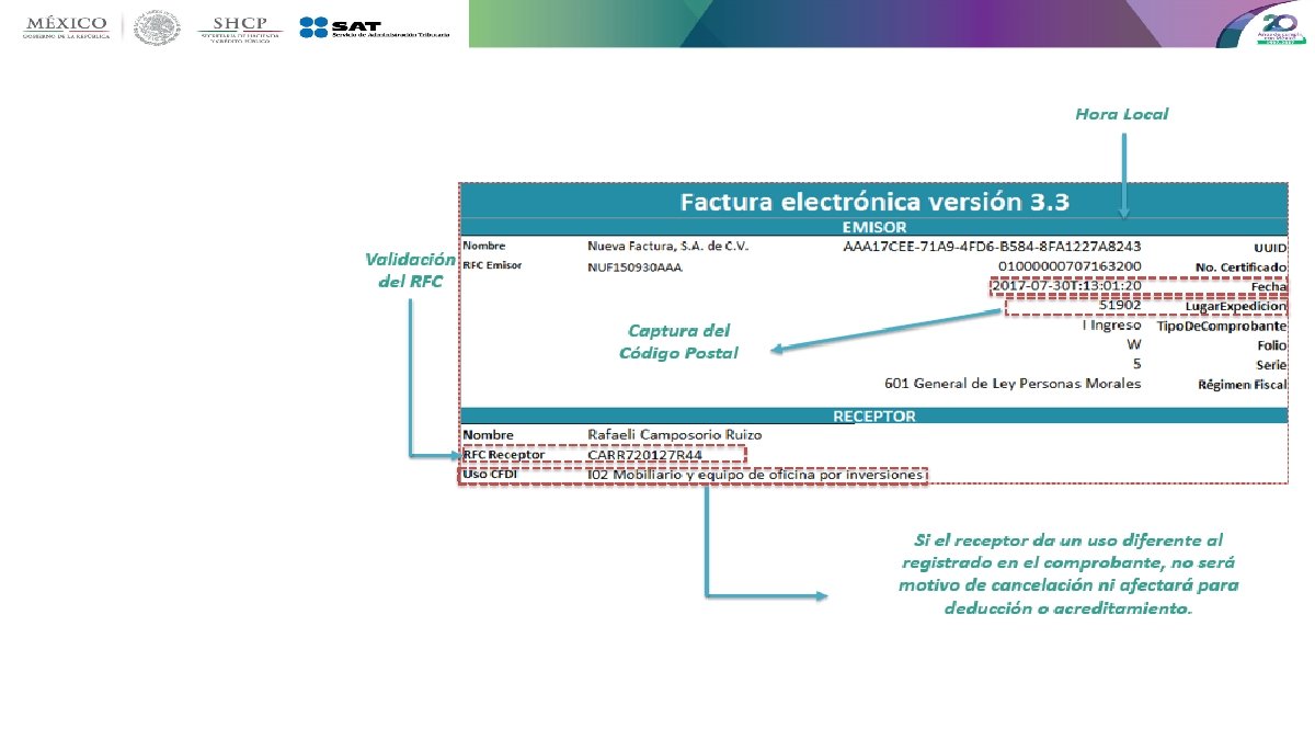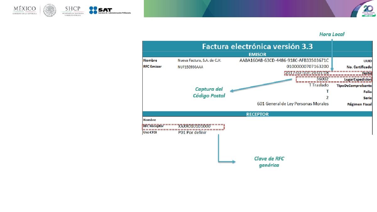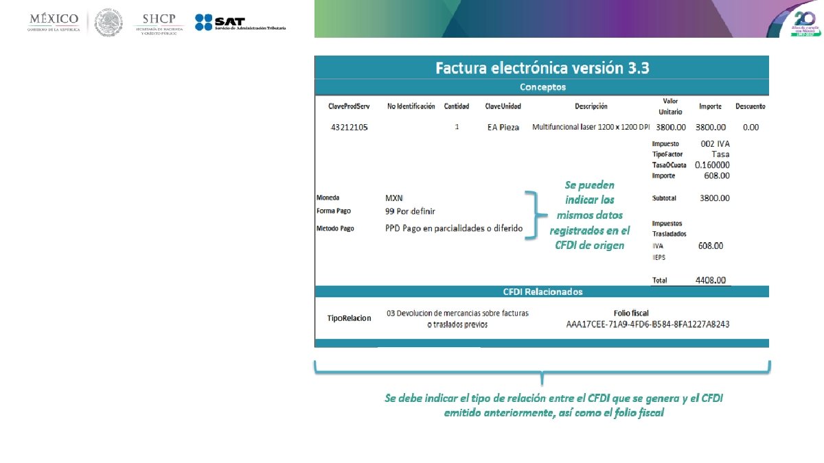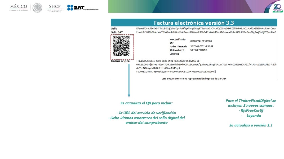Principales cambios • Se incorporan nuevos tipos de comprobantes. • Se incluye el uso del comprobante desde el punto de vista del receptor. • Uso de las zonas horarias, basado en el código postal del emisor. • Unificación de catálogos y tipos de datos, comunes para CFDI y complementos. • Método y forma de pago están invertidos respecto de la versión vigente. • Se estandariza la relación entre los comprobantes. • Los conceptos deben tener una clave de producto o servicio y una unidad de medida estandarizada. • Se incluye por cada concepto sus descuentos e impuestos aplicables. • La serie y folio se integran a la cadena original. • Se actualiza el código QR de la representación impresa.