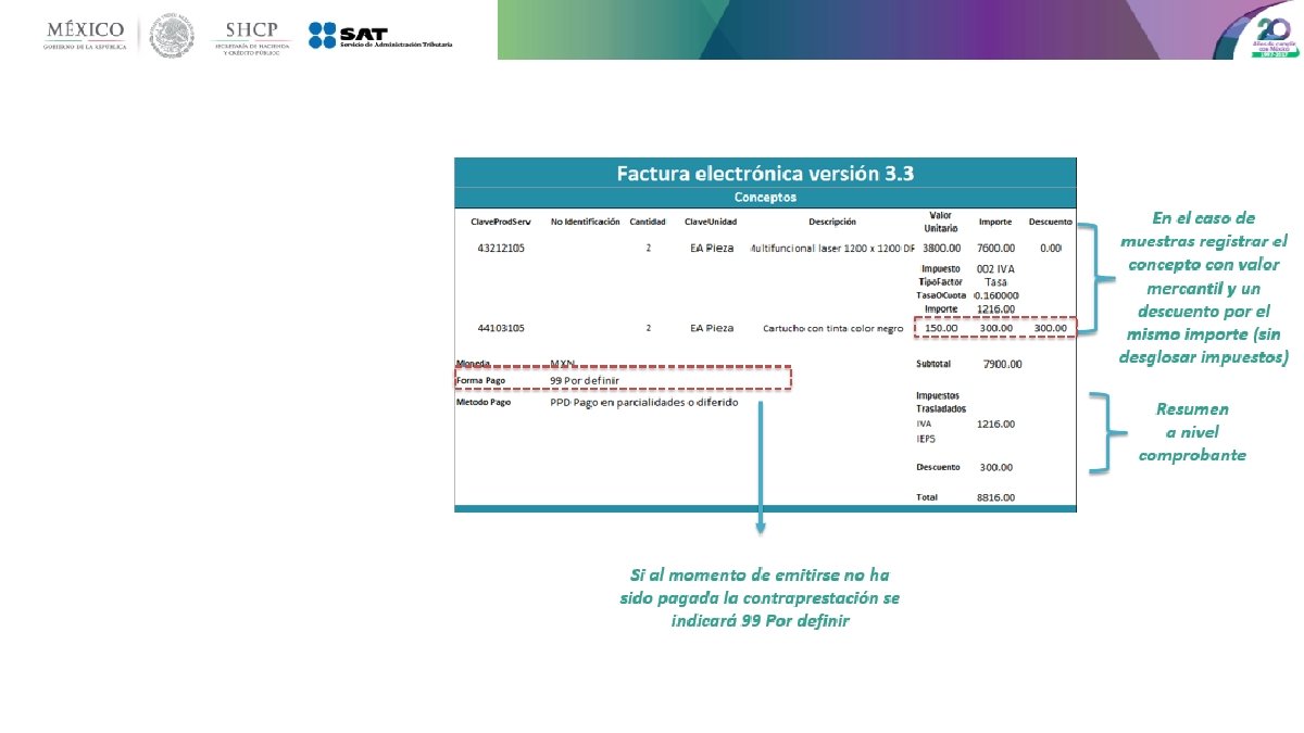 Caso práctico CFDI versión 3. 3 B Planteamiento: Durante el buen fin una empresa que se dedica a la venta de equipo de fotocopiado e impresoras, pone a disposición de sus clientes la promoción de que en la compra de cada impresora obtiene un cartucho de tinta gratis con valor de $150. 00 Cómo tiene que emitir la factura para amparar ésta operación si a un cliente le vendió dos impresoras con valor unitario de $ 3, 800. El pago: en una sola exhibición de manera diferida Emisión del CFDI: El contribuyente debe emitir un CFDI de tipo Ingreso