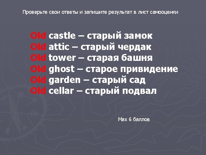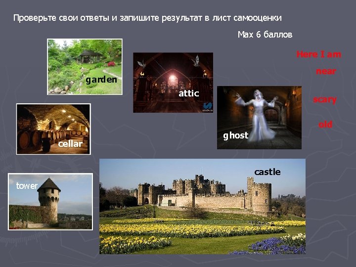 Переведите на русский язык «слова из Замка» castle attic near tower ghost garden Here I am cellar old scary