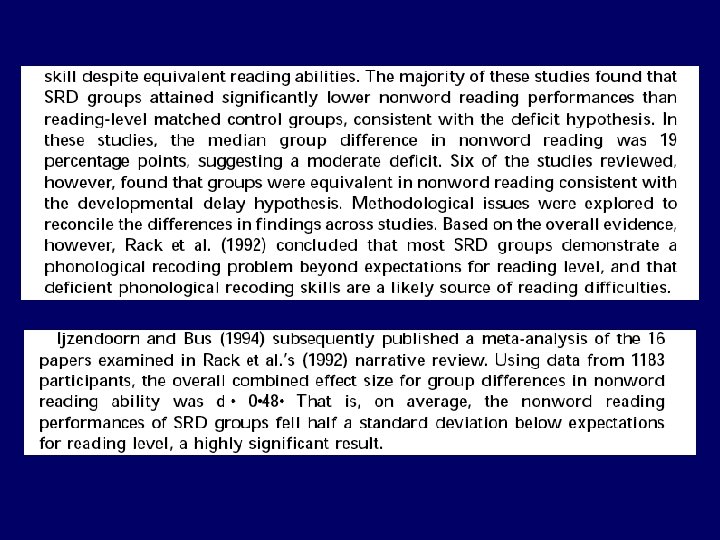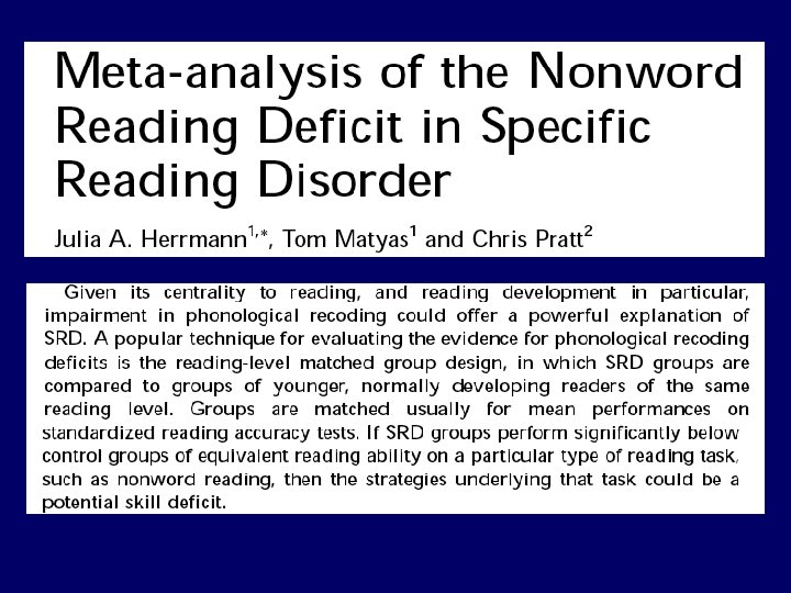 In a reading level match (RLM) design, individuals with reading disabilities are matched with younger typical readers on a measure of reading ability with a real-word reading test. After this match on realword reading, both groups are compared on their nonword-reading. The RLM design is usually preferred to the traditional chronological-age match design as many information processing differences between disabled readers and typical readers of the same age could as well be the result of both groups’ different reading experiences (cf. Geudens, Sandra, & Van den Broeck, 2004). Given the experimental control on reading level, the RLM design is generally considered a more selective device in isolating critical processing differences between disabled and typical readers (cf. Stanovich & Siegel, 1994). Despite the popularity of the RLM design, this design is, however, not without methodological problems and interpretational ambiguities (Goswami & Bryant, 1989; Jackson & Butterfield, 1989). The central problem is that the RLM design inevitably confounds reading level with age: the disabled readers necessarily being older than the control subjects…