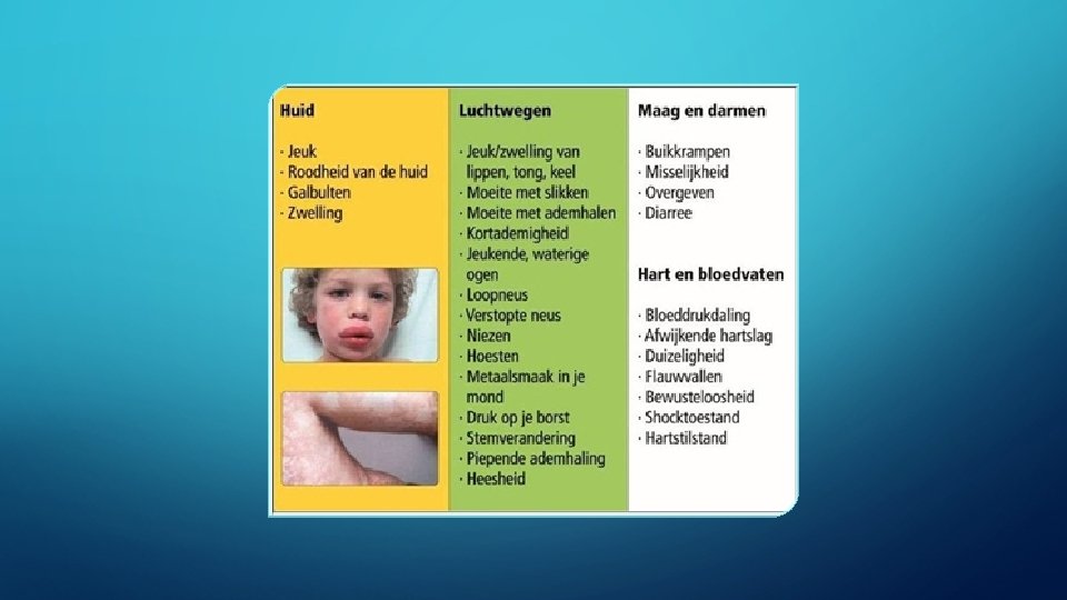 SYMPTOMEN ANAFYLAXIE • Bovenste luchtweg: rhinoconjunctivitis (astma verschijnselen o. b. v. allergie), gezwollen tong en/of lippen, dikke keel, moeite met inademen, heesheid, kuchen, stridor • Onderste luchtweg: piepen, hoesten, lage zuurstofsaturatie • Circulatie: hypotensie, slap worden, verminderd aanspreekbaar, bewustzijnverlies • Gastro-intestinaal: jeuk in mond, misselijk, braken, buikpijn, krampen, diarree