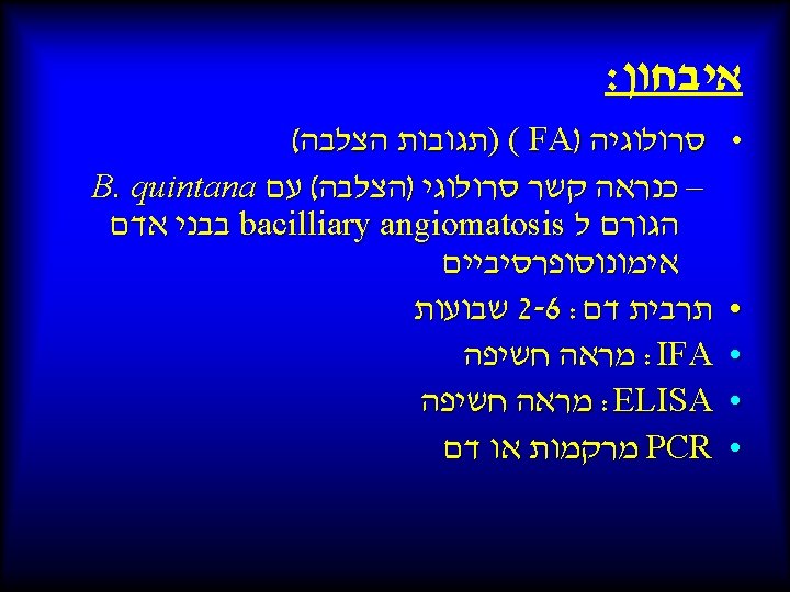 Seroprevalance in cats B. henselae - מס' ניכר של חתולים בעולם נחשף ל • Hawaii: 47%, Japan: 15%, S. Africa: 21% USA: 15 -55%, (serology) • Israel – 40% [45/114] (serology) • 25. 1% (84/334) of general cat population positive by molecular screening (Harrus 2014)