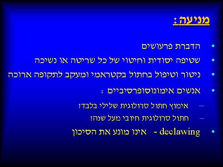 טיפול או חיסון • Doxycycline, amoxicillin, enrofloxacin, and rifampin (4 -6 weeks) may reduce the level of bacteremia in the infected cat or dog. • The ability of any antibiotic or antibiotic combination to completely clear B. henselae from the blood stream has not been established. • Given the duration of treatment necessary to clear the bacteremia and the concern for development of antimicrobial resistance, treatment is recommended only for pets that have clinical symptoms.