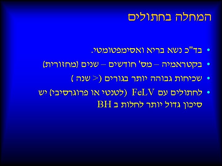 המחלה בחתולים Sick seropositive cats are more likely to have uveitis stomatitis, kidneys and urinary tract diseases. (seroepidemiologic survey!!) . • המחלה בחתולים היא מחזורית ופרססטנטית • נמשך חודשים או שנים