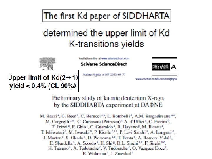 Comparison of results Shift [e. V] Reference KEK E 570 +2± 2± 2 PLB 653(07)387 SIDDHARTA (He 4 with 55 Fe) +0± 6± 2 PLB 681(2009)310 SIDDHARTA (He 4) +5± 3± 4 SIDDHARTA (He 3) -2± 2± 4 ar. Xiv: 1010. 4631, PLB 697(2011)199 *error bar