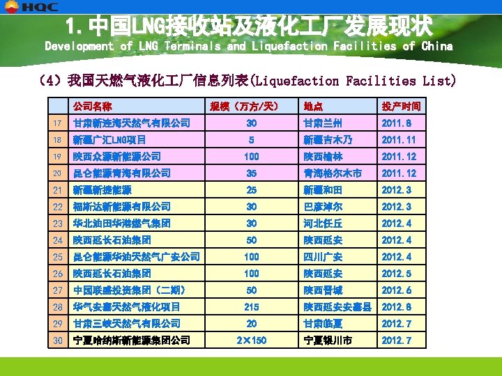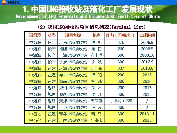 1. 中国LNG接收站及液化 厂发展现状 Development of LNG Terminals and Liquefaction Facilities of China (3)我国天燃气液化 厂技术发展概况 Liquefaction Facilities 投产项目数量 year 总液化能力 (万方/天) >30万方/天 项目数量 >100万方/天 项目数量 2000 -2010 760 25 8 3 2011 470 12 9 2 2012(1 -7月) 920 10 8 4 合计 2050 47 25 8 从统计数据可以看出: As can be seen from the statistics Ø 2011、2012年建成投产的液化 厂数量快速增长,规模大幅提高; Ø The quantity and scale of liquefaction facilities are fast growing. Ø 天然气液化 厂的单系列生产能力呈不断提高,2011、2012年投产的项目单套规模 在 30万方、100万方以上的数量快速增长。 Ø The capacity of single liquefaction facilities continues to expand.