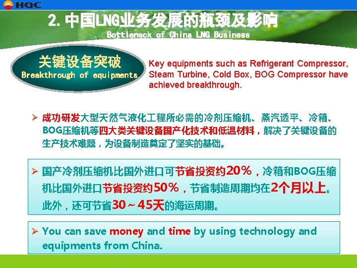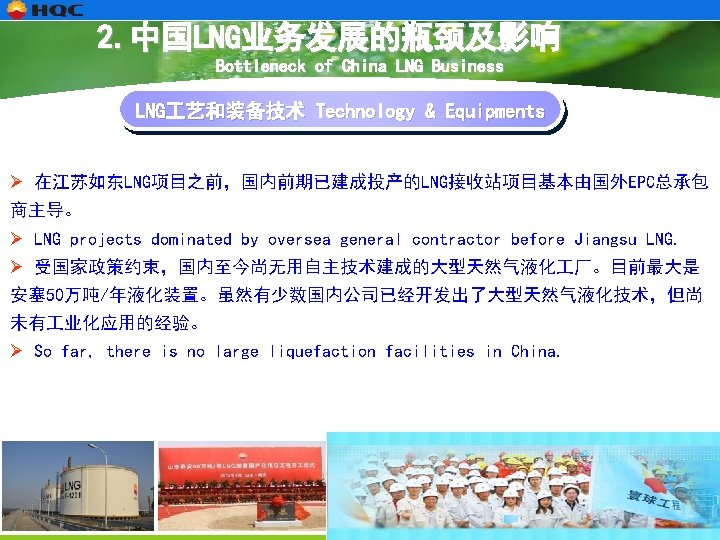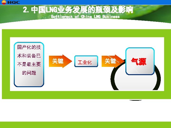 2. 中国LNG业务发展的瓶颈及影响 Bottleneck of China LNG Business 中国LNG业务发展的瓶颈 Bottleneck of China LNG Business 气源 Source LNG价格 Price 技术和装备 Technology & Equipments