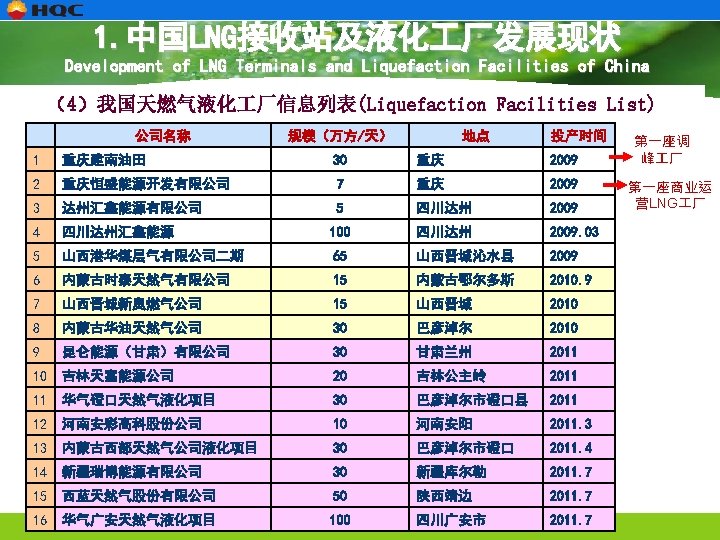 1. 中国LNG接收站及液化 厂发展现状 Development of LNG Terminals and Liquefaction Facilities of China 华气安塞液化天燃气项目 Ansai Liquefaction Facility Ø 地点:陕西延安安塞(Ansai, Shaanxi) Ø 规模: 50万吨/年(215万方/天)0. 5 Mt/a Ø LNG储存能力(Storage Capacity): 30, 000 m 3 Ø 2012年 8月开车成功(Onstream: Aug, 2012) Ø 部分设备国产化:冷箱、BOG压缩机、单 包容LNG储罐 Equipment Domestication : Cold Box, BOG Compressor, Storage Tank