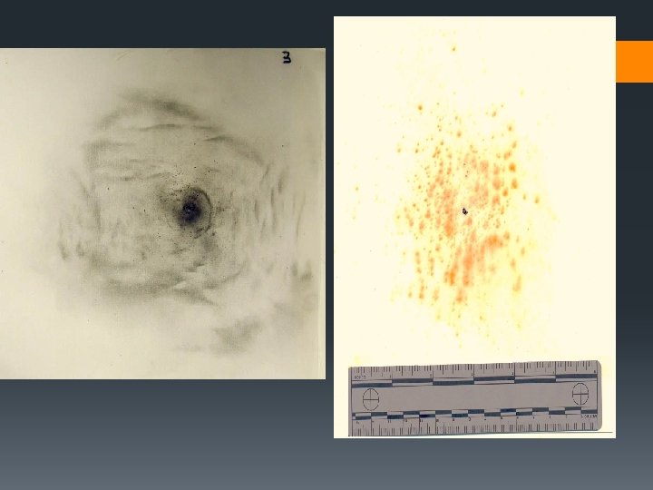 Distance to Target • The Greiss Test converts nitrites to an orange-red color. • Sodium rhodizonate reacts with traces of lead to make purple spots.