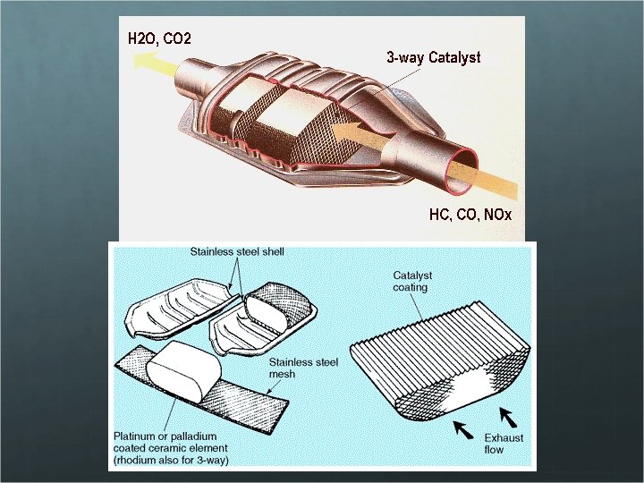 Three Way Catalytic Converter Reduction of nitrogen oxides to nitrogen and oxygen: 2 NOx → x. O 2 + N 2 Oxidation of carbon monoxide to carbon dioxide: 2 CO + O 2 → 2 CO 2 Oxidation of unburnt hydrocarbons (HC) to carbon dioxide and water: Cx. H(2 x+2) + [(3 x+1)/2]O 2 → x. CO 2 + (x+1)H 2 O Unwanted reactions can occur in the three-way catalyst, such as the formation of odiferous hydrogen sulfide and ammonia.