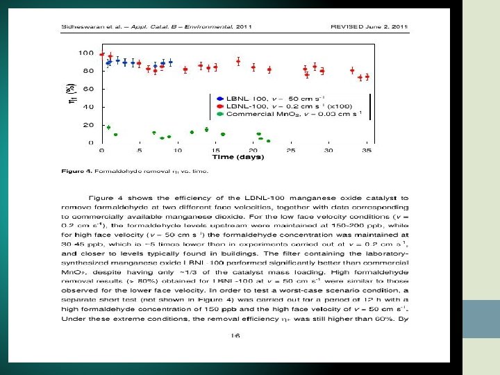 Lawrence Berkeley National Laboratories Mn. Ox Catalyst Na. Mn. O 4 + Mn. SO 4 + H 2 O = Mn. O 2 +H 2 SO 4 + Na 2 SO 4 +H 2 O Performance: 80% single-pass formaldehyde destruction at 100 fpm, 30 -45 ppb foraldehyde (CH 2 O) -No byproducts (formate, CO, etc) -3 months continuous operation -20% drop in formaldehyde removal Sidheswaran et al, 2011, Lawrence Berkeley National Laboratories