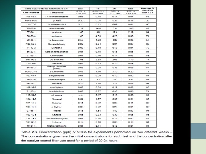 VOCs -Formaldehyde • The highest levels of airborne formaldehyde have been detected in indoor air, were it is released from products such as building materials and home furnishings. • Formaldehyde levels range from 0. 10 to 3. 8 parts per million (ppm) in homes. • Formaldehyde has been detected in ambient air; the average concentration reported in U. S. urban areas were in the range of 1. 1 to 20 parts per billion (ppb). • Formaldehyde is a known carcinogen. Source: U. S. Environmental Protection Agency, http; //www. epa. gov/ttn/atw/hlthef/formalde. html