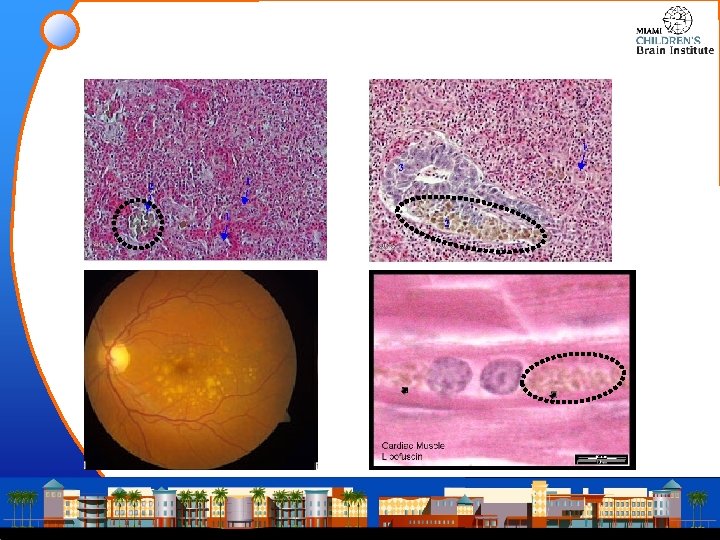 Etymology • Ceroid • L. [cera], wax, + G. [eidos], appearance • Compare with “cerumen” • Lipofuscinosis • • • The product of peroxidation of unsaturated fatty acids and symptomatic, perhaps, of membrane damage rather than being deleterious in its own right G. [lipos] “fat” L. [fuscare] “to make dark” Compare with “obfuscation” (~“brown”) L. [-osis] “abnormal condition” or “a state of disease” • Ceroid and Lipofuscins are not the same • “Ceroid is acid fast, fat insolvent, and probably a type of lipofuscin, although differing from true lipofuscins by failing to stain with Schmorl ferric-ferricyanide reduction stain”