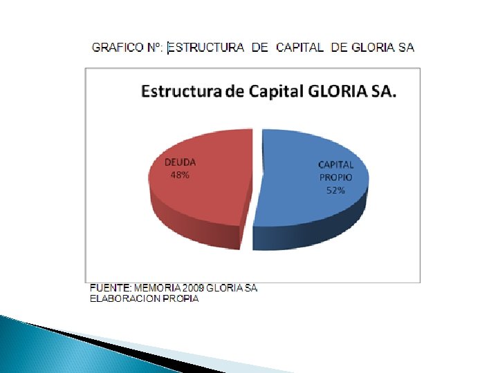 Fuentes de Financiamiento a Corto Plazo La empresa Gloria SA. es una de las empresas más grandes actualmente que abarca gran parte del mercado Peruano, posee muchas fuentes de financiamiento dentro de los cuales destacan: los prestamos de muchas empresas como es el caso de la empresa Oriental de Emprendimientos S. A. esta empresa se dedica a la pasterización de la leche la cual posee 452 235 acciones, el valor de cada acción es de S/. 1 , esta cantidad comprende desde el último día del año 2009 y los primeros 6 meses del año 2010, otra empresa que cabe mencionar es Agroindustrial del Perú.
