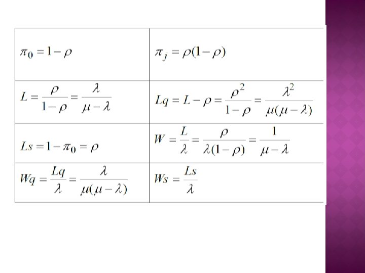 Wq = Tiempo de espera en la línea de espera. (M/M/S) S=1 Y S>1 (M/M/S) VARIACION DE COLA FINITA S=1 Y S>1(COLA FINITA) (M/M/S) VARIACION DE FUENTE DE ENTRADA FINITA S=1 Y S>1 REPARACION DE MAQUINAS (M/M/1)(GD/∞/∞), (M/M/C)(GD/∞/∞) (M/M/1)(GD/N/∞), (M/M/C)(GD/N/∞) VARIACION DE COLA FINITA (COLA FINITA) (M/M/R)(GD/K/K) MODELO DE SERV A MAQ. ORIGEN FINITO (M/M/∞)(GD/∞/∞) MODELO DE AUTOSERVICIO. FORMULARIO DE ACUERDO AL MODELO: