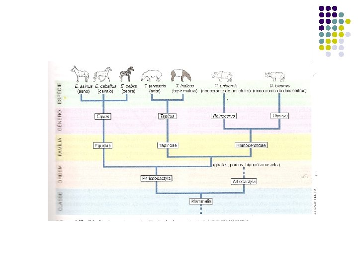 Categorias Taxonômicas -Espécie: conjunto de seres semelhantes capazes de cruzar em condições naturais, produzindo uma descendência fértil. • Égua X Jumento(Asno/Jegue) = Burro/Mula fértil híbrido não • Cavalo X Jumenta = Bardoto -Gênero: agrupamento de espécies diferentes que possuem características em comum (semelhantes) -Família: gêneros que apresentam semelhanças -Ordem: famílias semelhantes -Classe -Filo -Reino