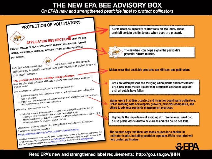 Honey Bee Health USDA and EPA 2013 • There are multiple factors playing a role in honey bee colony decline • Forces impacting honey bee health are complex – Parasitic Varroa mite – major factor – Bee viruses – major factor – Poor genetic diversity – Poor nutrition among honey bee colonies – Need to determine actual pesticide exposure and effects to bees in the field