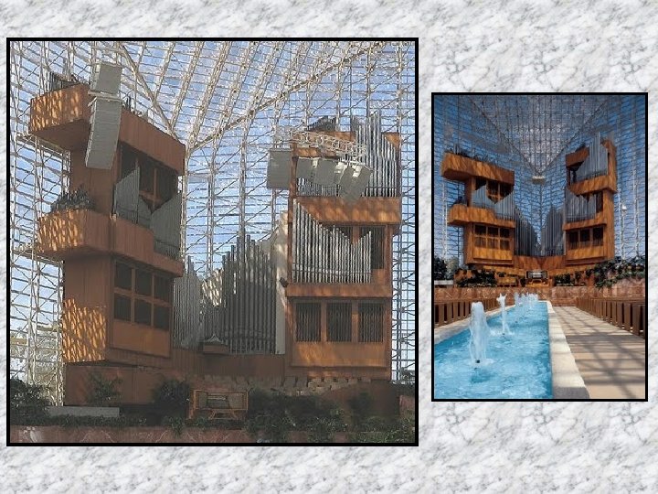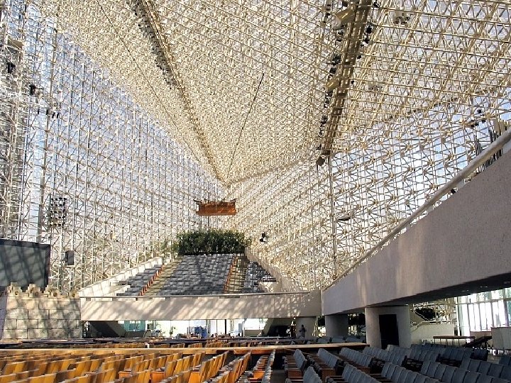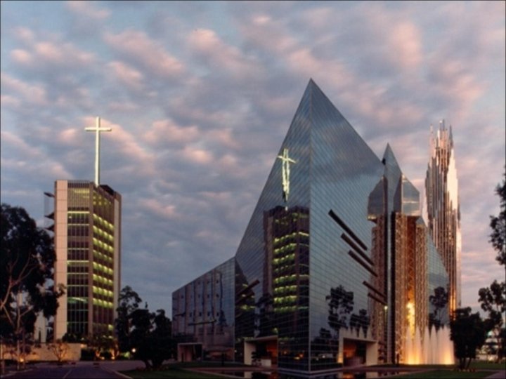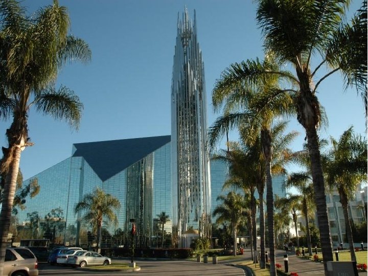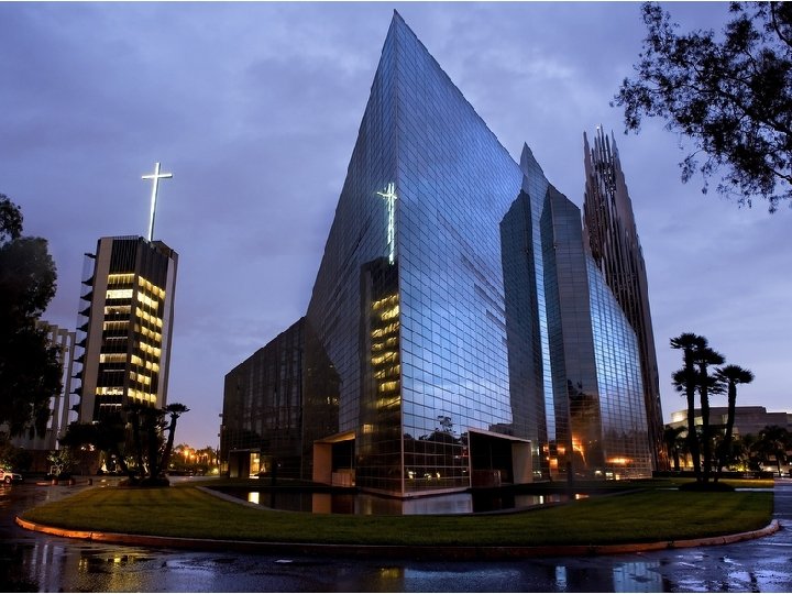 Si jamais il y a une église de style “Hollywood” dans le vrai sens du mot, c’est bien l’église de la Communauté de Garden Grove, mieux connue sous le nom de Cathédrale de Cristal. Ironiquement , elle n’est pas située à Hollywood, mais seulement à quelques kilomètres de Disneyland, dans le comté d’Orange. Mais la Cathédrale de Cristal est de show-biz pure, de stars de spectacles ou de conférenciers attirés par l’utilisation judicieuse du pouvoir des médias comme la télévision nationale. Le plus grand bâtiment de verre du monde a été construit par le révérend Robert Schuller a commencé en 1955 en tant que pasteur de la première église “drive-in” en Californie, à Garden Grove. Elle était située dans un ancien ciné-théâtre et Schuller prêchait au balcon de la cafétéria. Après un succès notable et en profitant de l’emplacement idéal, le révérend Schuller à ouvert la Cathédrale de Cristal en 1980.