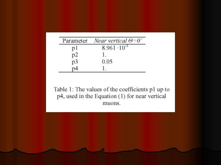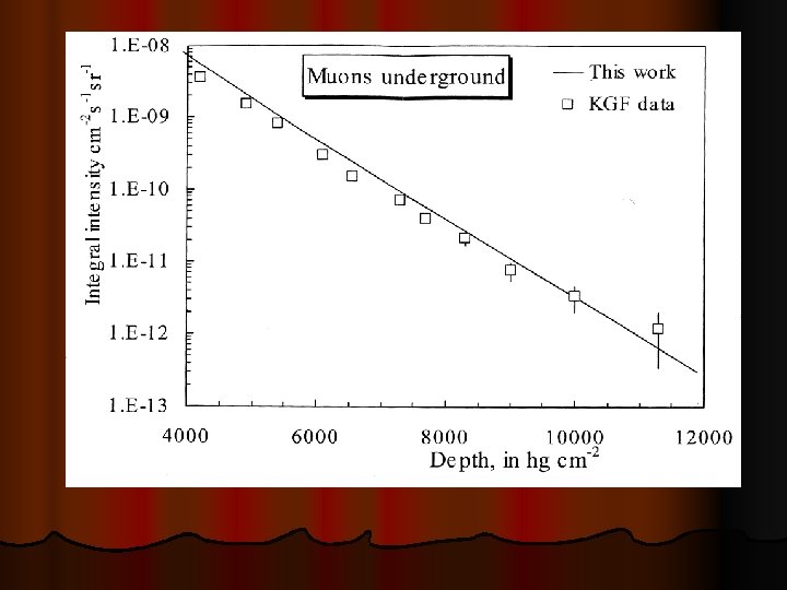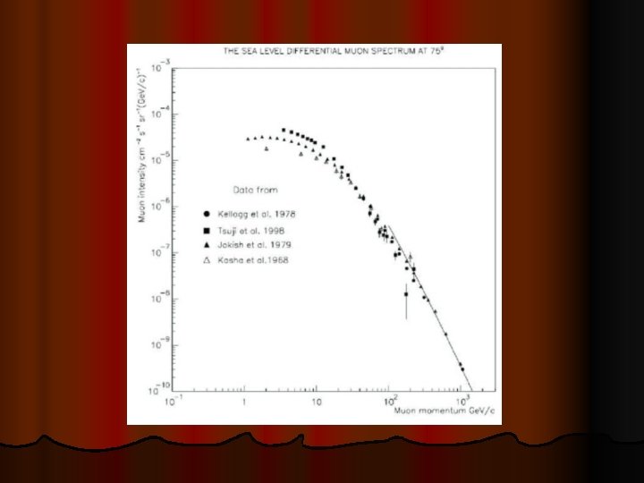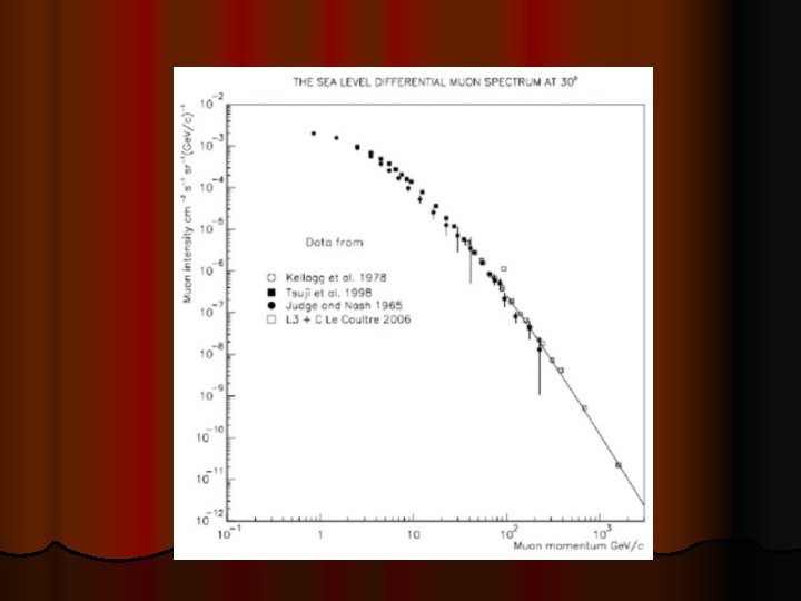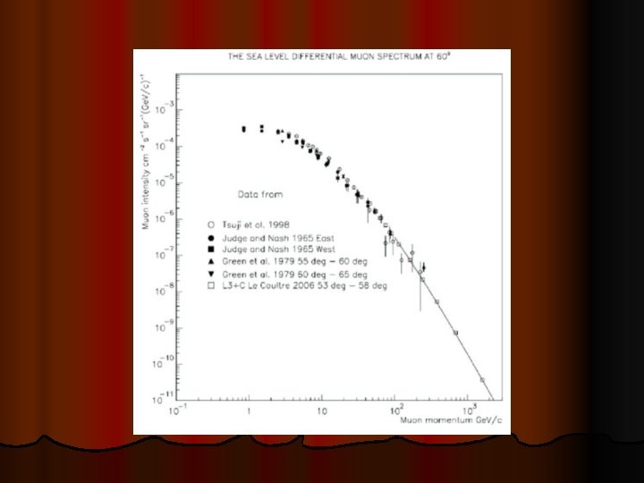 Absolute differential muon fluxes at various zenithal angles The absolute differential muon data in the energy region 0. 2 Ge. V/c to 100 Ge. V/c are fitted by parabola on a log – log scale: log I ( ) = a ln 2 p + b ln p + c , where p is the muon momentum in Ge. V/c.