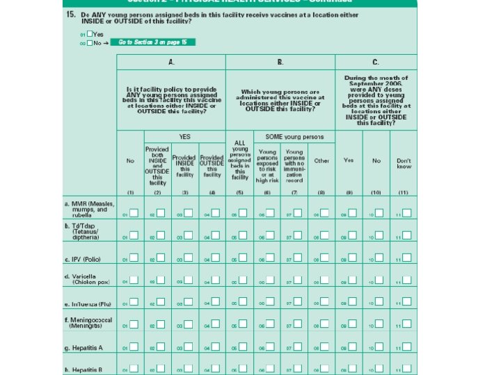Results of JRFC 2004 Hepatitis B data collection Alarmingly low levels of availability and provision Systematic patterns of provision across multiple outcomes • Any young people receive Hepatitis B vaccine • Who receives vaccine • Any doses given in reference period