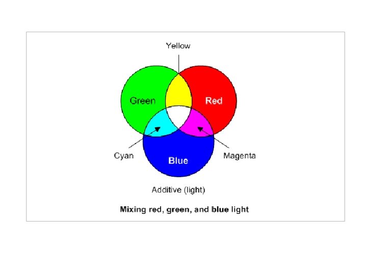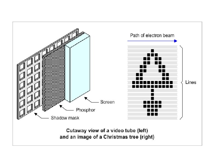 Coloured Display § Each of these dots has its own hole in the shadow mask, and each dot is formed from a different phosphor, which is chosen to fluoresce with that color. § Three electron guns, one to stimulate the red dots, one for the green, and one for the blue. The three electron beams scan across the screen together, but the intensity of each beam can be varied independently.