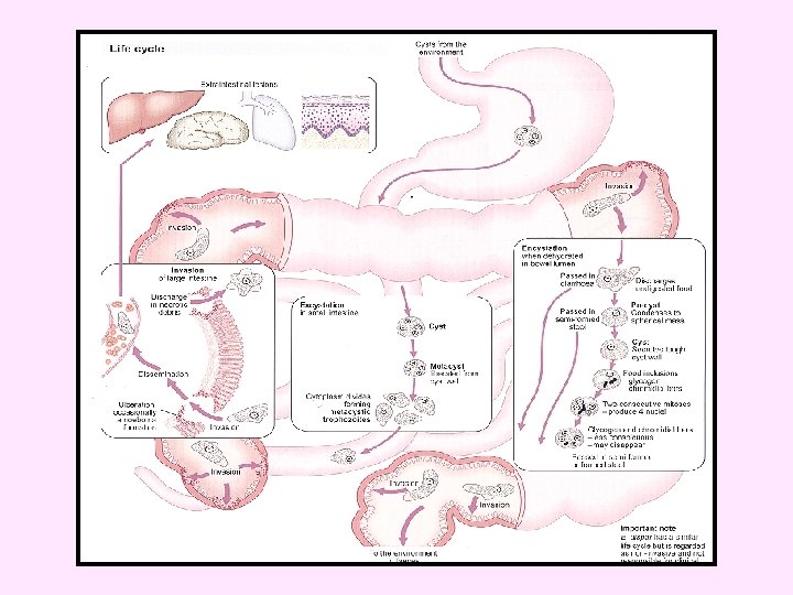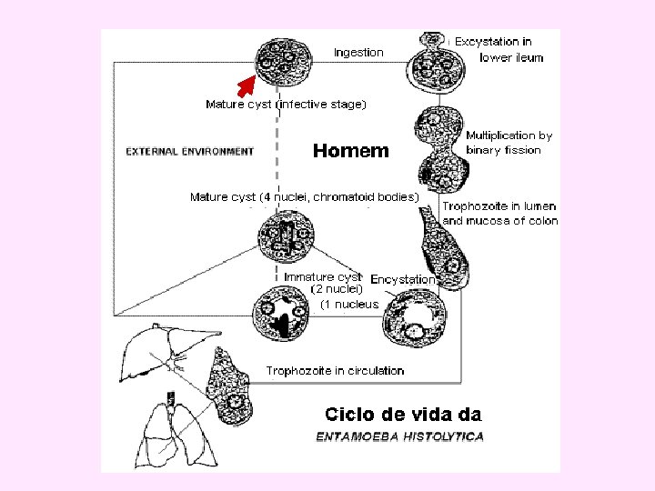 • • Life cycle Infection by Entamoeba histolytica occurs by ingestion of mature cysts in fecally contaminated food, water, or hands. Excystation occurs in the small intestine and trophozoites are released, which migrate to the large intestine. The trophozoites multiply by binary fission and produce cysts. Cysts and trophozoites are passed in feces Cysts are found in formed stool, whereas trophozoites are found in diarrheal stool.