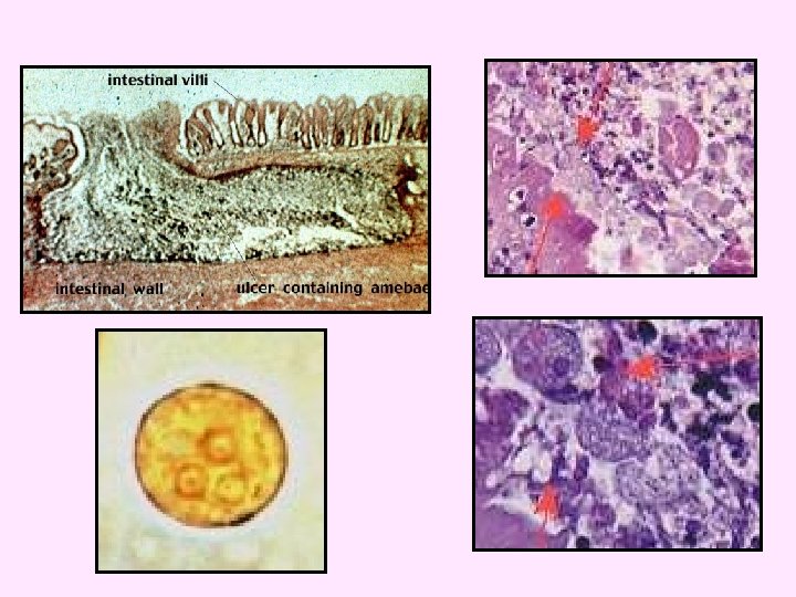 in summary pinpoint lesion on mucous membrane • flask-shaped Ulcers • Amoebic liver abscess • anchovy sauce sputum (lung) • brain , spleen , genito-urinary tract • amoeboma simulate carcinoma. - Cyst carrier is a healthy persons (trophozoite only in intestinal lumen Lumenal form). - Pre-employments Stool analysis was done for food handler.