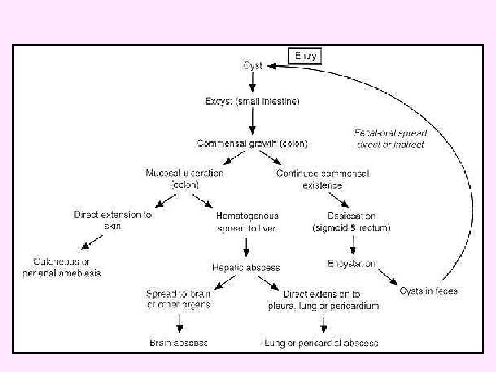 Complications and squeals -Perforation hemorrhage (rare) -Secondary infection Amoeboma Obestraction intusssception -Invasion of blood vessels. -Direct extension outside bowel -Pretonitis haemorrhag -Surronging inflammatory reaction -A mass under oedemotous mucosa Amoeboma clinically simulates neoplasm -Extraintestinal lesion
