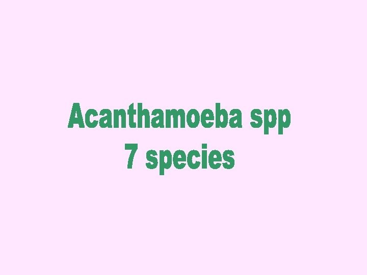 FREE-LIVING PROTOZOA Ameba Diseases • Naegleria fowleri PAM • Acanthamoeba spp. GAE, skin or lung lesions, amebic keratitis.