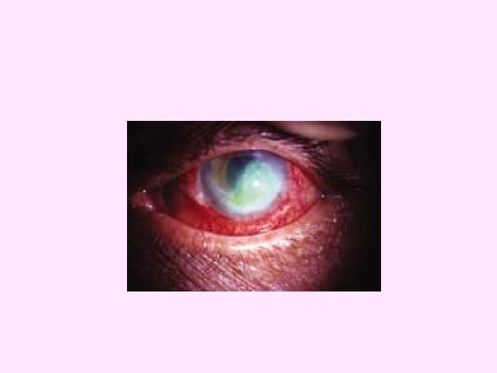Amebic Keratitis • Predisposing factors ocular trauma, contact lens (contaminated cleaning solutions). • Symptoms ocular pain, corneal lesions (refractory to usual treatments). • Diagnosis demonstration of amebas in corneal scrapings. • Treatment difficult, limited success corneal grafts often required.