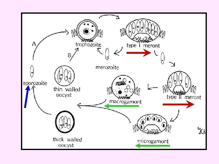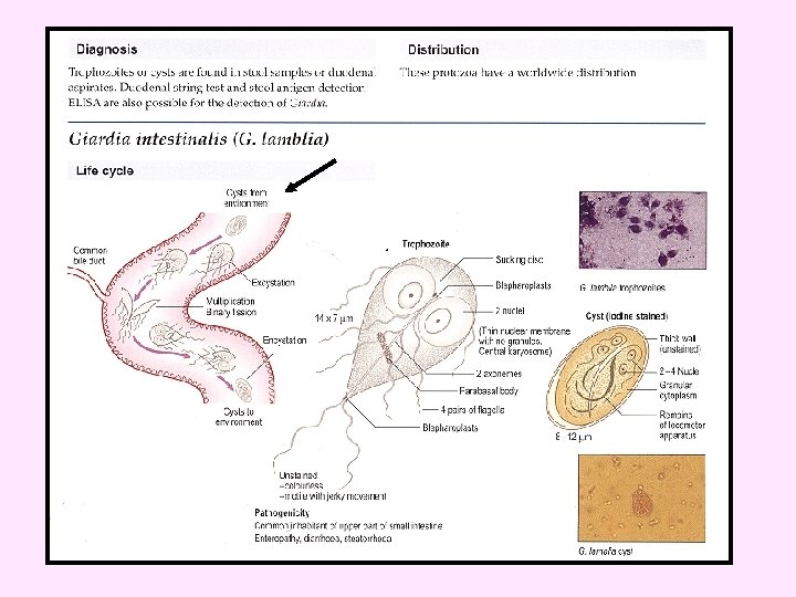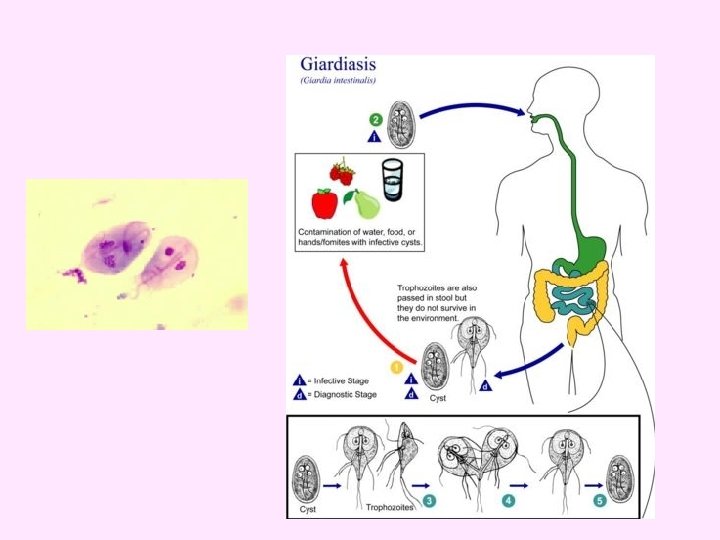 Pathology & clinical picture: • Immunocopetent persons asymptomatic or mild enterocolitis , last about 2 weeks. • Immunodeficient persons sever diarrhoea with malabsorption. Diagnosis & morphology: • duodinal biopsy : gametes or schizont (4 -8 merozoites) in epithelial cells. • Stools : oocyst 4 -5 m with 4 sporozoites (without sporocyst).