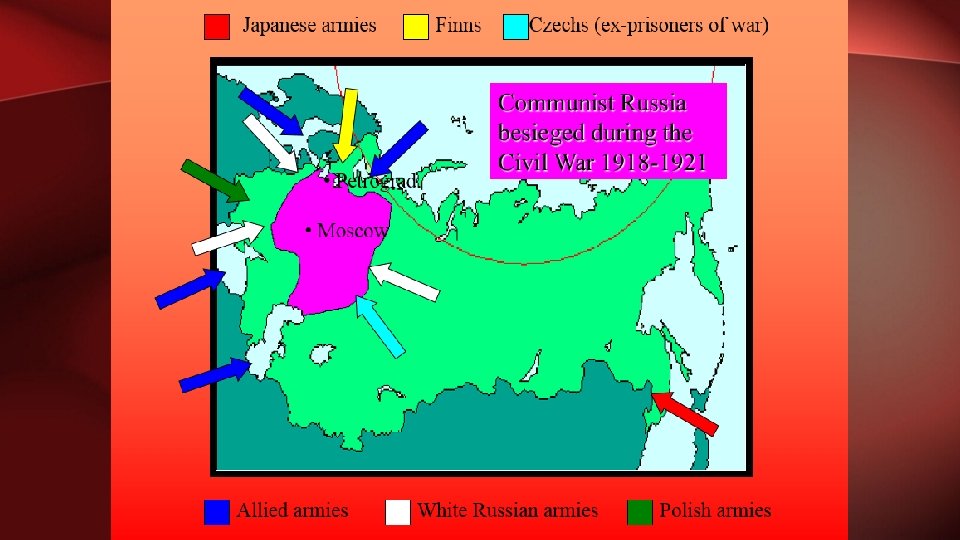 The Civil War 1918 -1921 The opponents of the ‘Reds’, Lenin and the Communists, were known as the ‘Whites’. The Whites were a mixture of aristocrats, royalists, churchmen, army officers and many others. The Whites were led by Admiral Kolchak and Generals Deniken and Wrangel. The Whites were supported by Britain, France, Japan and the USA, countries that were alarmed at the possible spread of communism. At the same time, Lenin fought a war against Poland, a new country formed by the Treaty of Versailles in 1919. Although in a very dangerous position, the Communists were able to win the Civil War. This was because the Whites were divided, while the Reds controlled the key cities, industrial centres and communication links. Trotsky’s tough leadership of the new Red Army proved decisive in the victory over the Whites.