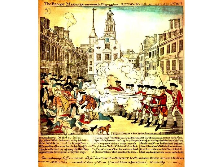 • Colonial response: – Boycott – Circular letter – John Dickinson, ‘Letters from a Pennsylvania Farmer’ (1767) – Tar and Feathering – Boston Massacre (1770) – Crispus Attucks – Paul Revere and Sam Adams – Committees of correspondence- exchange of ideas and unified response by colonial govt’s.