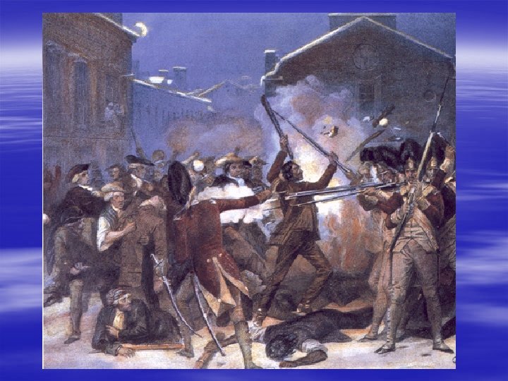 Boston Massacre § March 1770—British troops stationed in Boston § Crowd gathers around army § Snowballs w/rocks thrown at soldiers § Shots fired— 5 civilians dead, 8 wounded § Crispus Attucks 1 st to die