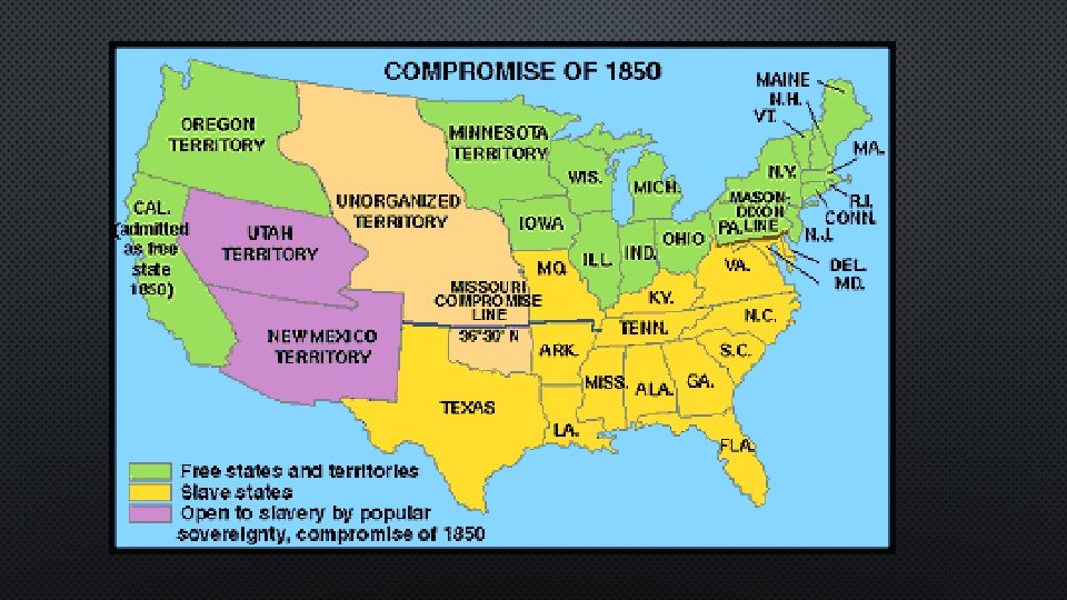 COMPROMISE OF 1850 • THE COMPROMISE OF 1850 • CALIFORNIA ADMITTED AS A FREE STATE. • “POPULAR SOVEREIGNTY” FOR TERRITORY GAINED IN THEMEXICAN-AMERICAN WAR. PEOPLE LIVING IN THE TERRITORY COULD DECIDE IF THEY WANTED SLAVERY. • NO SLAVE TRADE IN DC