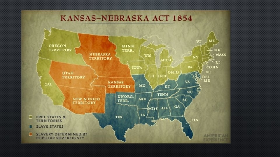 • THE KANSAS-NEBRASKA ACT WAS PASSED. • EFFECTIVELY REPEALED THE MISSOURI COMPROMISE – STATE CHOICE OVER FEDERAL LAW • SOUTH LOVED BUT NORTH HATED
