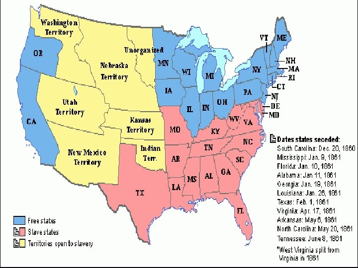 The Nation Splits Apart (8) • Dred Scott vs. Sandford – This landmark Supreme Court case ruled that African Americans did not have the rights of citizens – Slaves were property not people – This ruling prevented the U. S. Congress from outlawing slavery in the territories