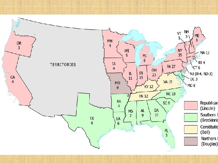 • • • Abraham Lincoln Elected (10) Runs as a Republican Wants to stop the SPREAD of slavery, not ABOLISH it Is elected November 6, 1860 South Carolina secedes December 20, 1860 11 other southern states quickly follow