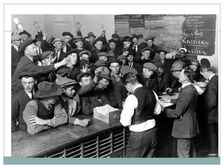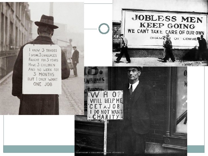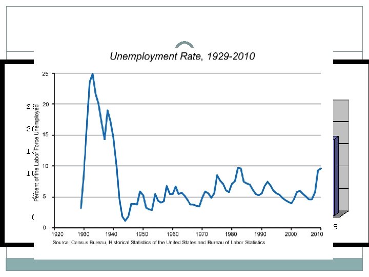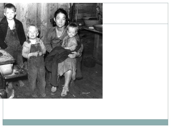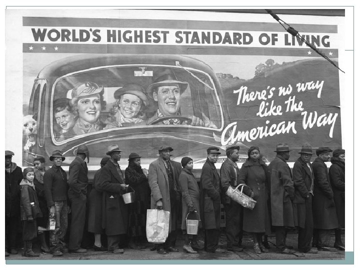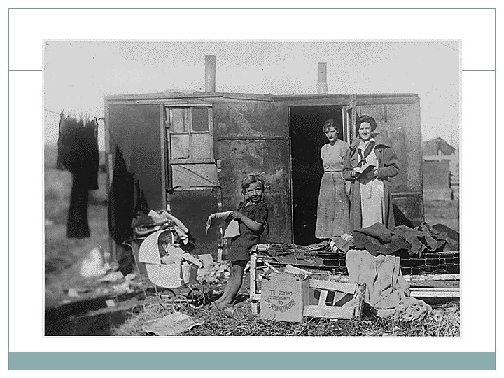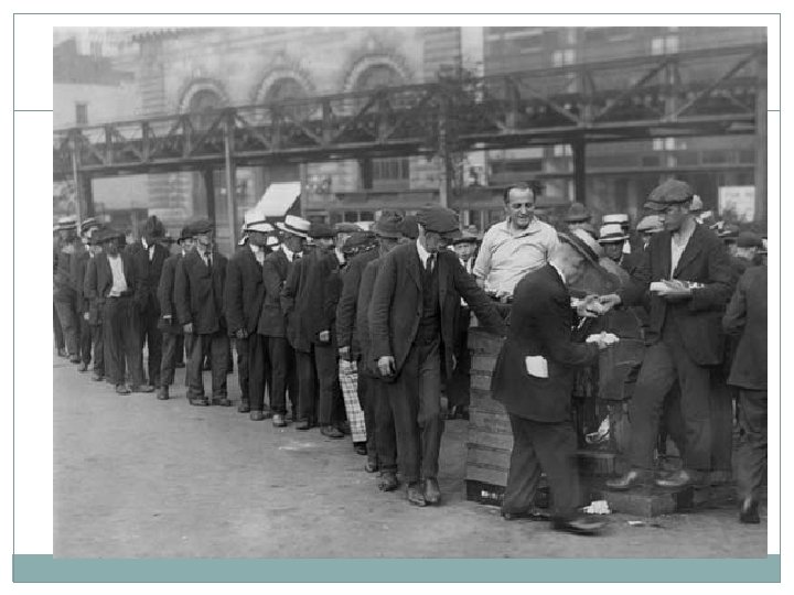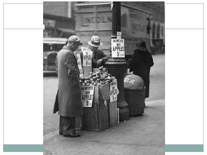 Causes of the Great Depression (1929 -1940) Income disparity and over-production/under-consumption 1. The US economy was producing more goods than it could consume (Roaring 20’s!) Most people were not wealthy enough to consume massive amounts, wages for most were too low to consume. Massive debt/Irresponsible financial policies 2. Banks were lending out more money than they actually had (banks crashed and closed/massive deflation). The small federal government of the 1920’s let businesses spin out of control (Republicans Coolidge and Harding). Foreign trade policy 3. WWI destabilized European economy, US did nothing to stabilize it, cut ourselves off from foreign trade (Hawley-Smoot Tariff made things worse) Aging Infrastructure 4. The railroads, bridges and building of the US were old and made transportation and costs of doing business more than they should have been. Agricultural Failures 5. Farmer’s prices had been dropping for several decades, farmers responded by producing more causing financial and environmental disasters.
