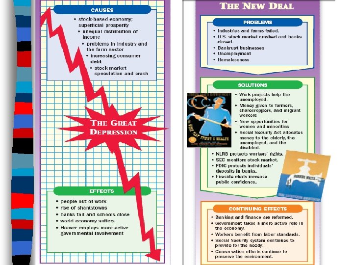 FDR & the New Deal ■ FDR initiated his New Deal, a series of laws that were designed to fight the depression by offering: –Relief: gov’t relief checks & jobs to get people back to work –Recovery: tried to end the depression by stimulating industry & farming –Reform: long-term solutions to America’s economic problems
