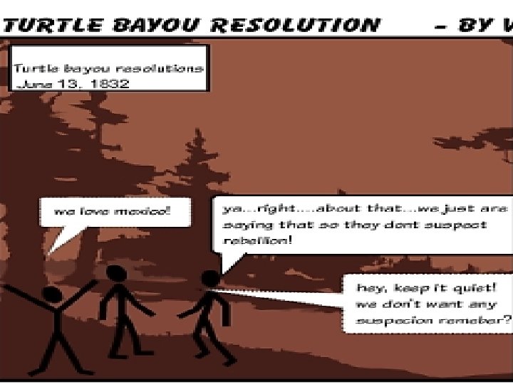 Protest at Anahuac • Led by Frank W. Johnson and William H. Jack 160 settlers marched to Anahuac and demanded the release of Travis and Jack. • A skirmish occurred between the settlers and Bradburn. Both sides called for reinforcements. • While waiting for reinforcements, the settlers adopted the Turtle Bayou Resolutions which said that they were not rebelling against Mexico, but supporting Antonio Lopez de Santa Anna. • Colonel Piedras came from Nacogdoches and removed Blackburn and ended the rebellion.